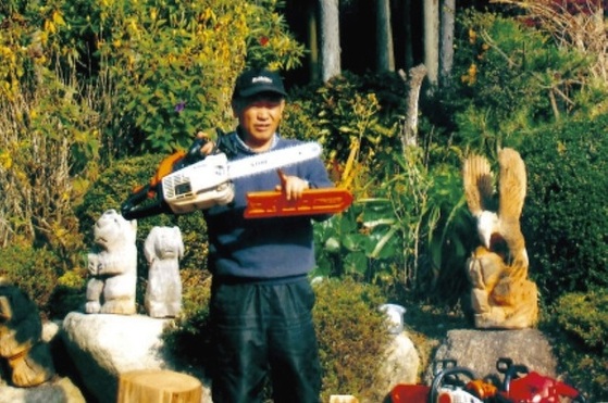 杉の木の原木をチェンソーで彫刻するアート。持ち山の間伐をしていて、何か人の役に立つ原木の使い方はないかと彫刻を始めました。自宅の庭に並んだ作品は熊、鷹、犬、うさぎ、いのしし等の動物が多く、ベンチや花壇のプランターは木のぬくもりが心を和ませてくれます。飼育場兼チェンソーの作業場は、丸太の手作りログハウスで必見です。