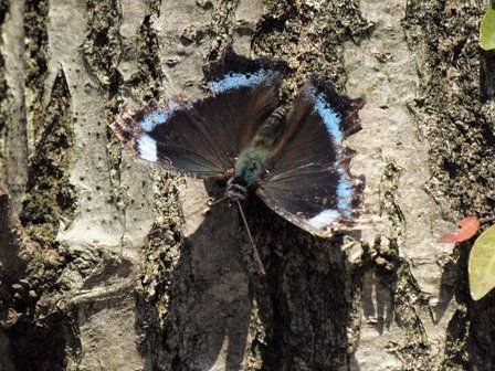 翅の表面には名前の由来となった青色の縦帯があります。裏面は濃淡のある黒褐色ですが、夏型では地色が明るく、秋型では暗くなります。早春に見られるものは成虫で越冬した秋型の個体なので、写真のように翅に損傷があることもしばしばです。
