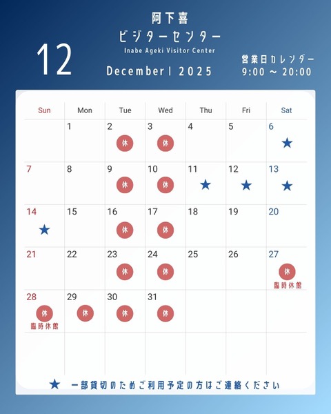 火曜日・水曜日及び12月29日から翌年1月3日(臨時休業あり)