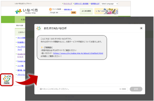 - いなべ市公式サイトの各ページに表示されている「おたすけAIいなロボ」のアイコンをクリック