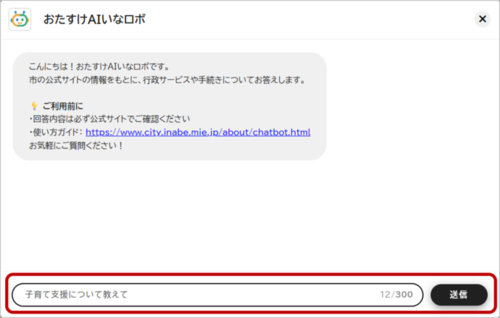 おたすけAIいなロボは、市民の皆さまの利便性向上を目的としたサービスです。市の手続きや制度について分からないことがございましたら、お気軽にご質問ください。