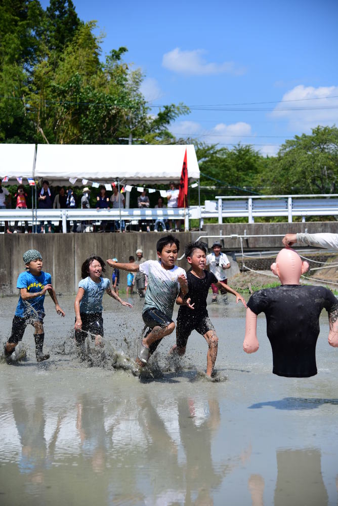 田んぼに入ると足に中々経験することのない泥の感触に参加者は大盛り上がり。その後、全身泥まみれになるまで、競技を楽しんでいただきました。