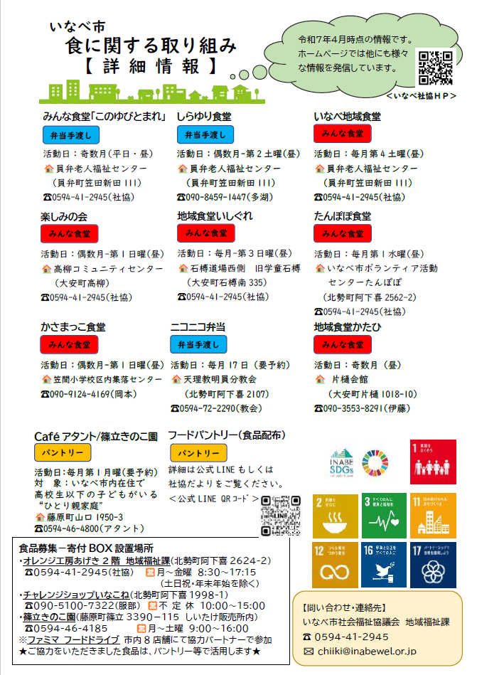 いなべ市民の方々が安心して生活するために、包括的な相談場所の設置や身近な居場所づくり、加えて市内の地域福祉活動に参加できる機会の提供し、地域のネットワーク構築を支援しています。その中で普段の生活の質を向上させることができるよう、健康や介護などの福祉啓発をも行っています。また、生活に困っている方、制度の狭間にいる方々の生活安定を図るため権利擁護の推進や支援を充実させるなど、誰ひとり残さないまちづくりを目指した取組を進めています。その一例として、食に関する支援があります。詳細は下記PDFをご覧ください。